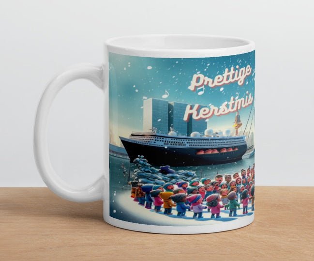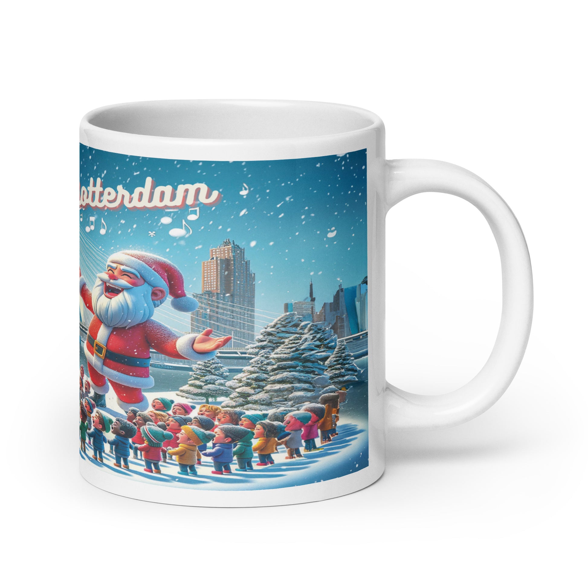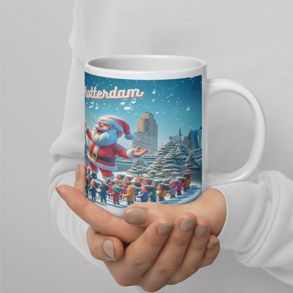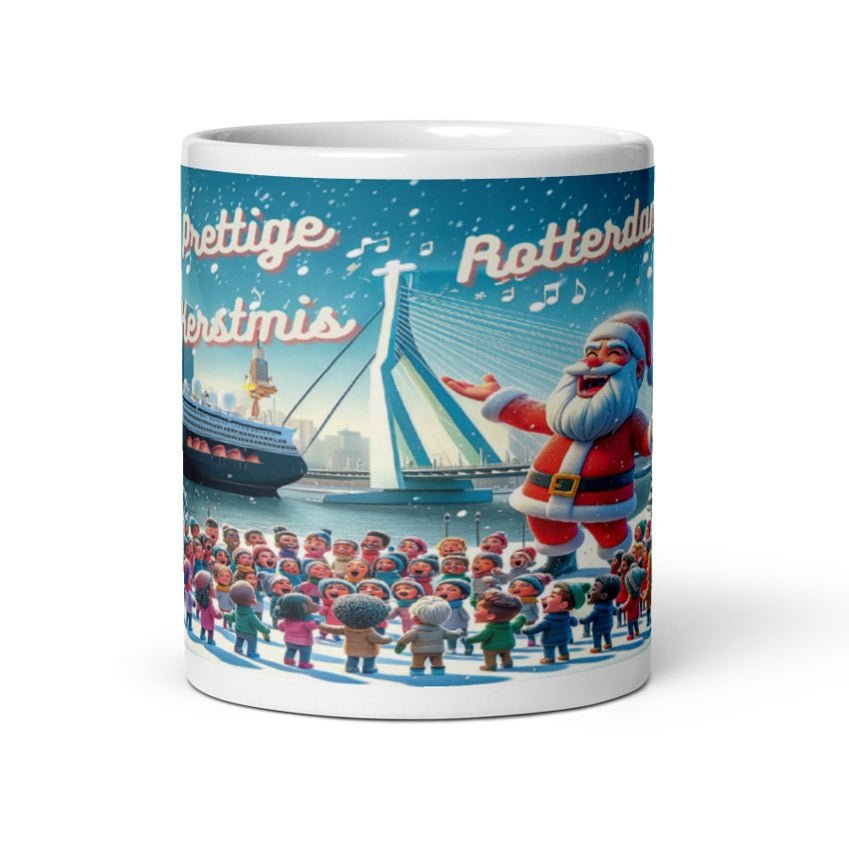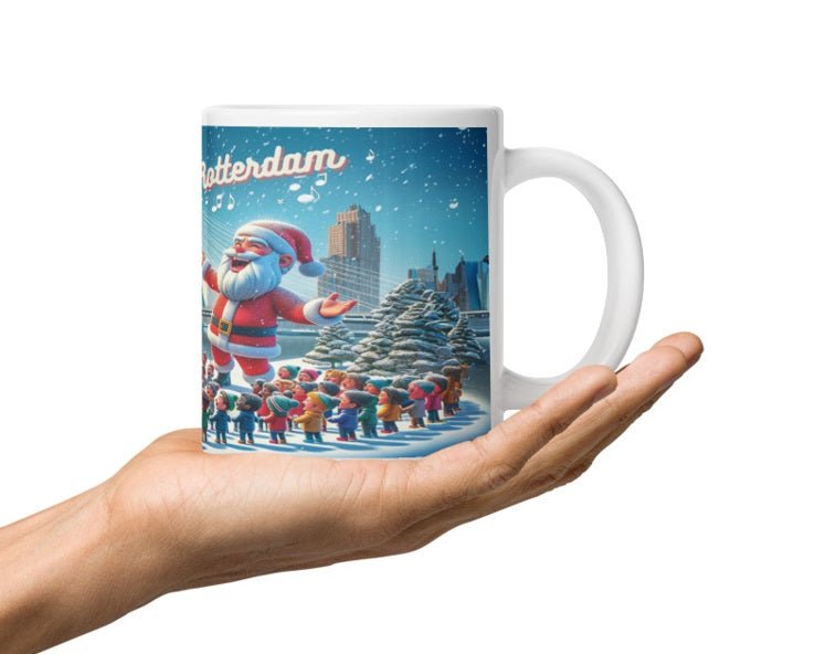 Deze betoverende mok brengt de feestelijke geest van Rotterdam tot leven met een vrolijke illustratie van de Kerstman die kerstliederen zingt samen met een groep enthousiaste Rotterdamse kinderen aan de kade. De levendige scène, gevuld met gelach en zang, is een perfecte weerspiegeling van de vreugde en samenhorigheid die de kerstperiode met zich meebrengt.